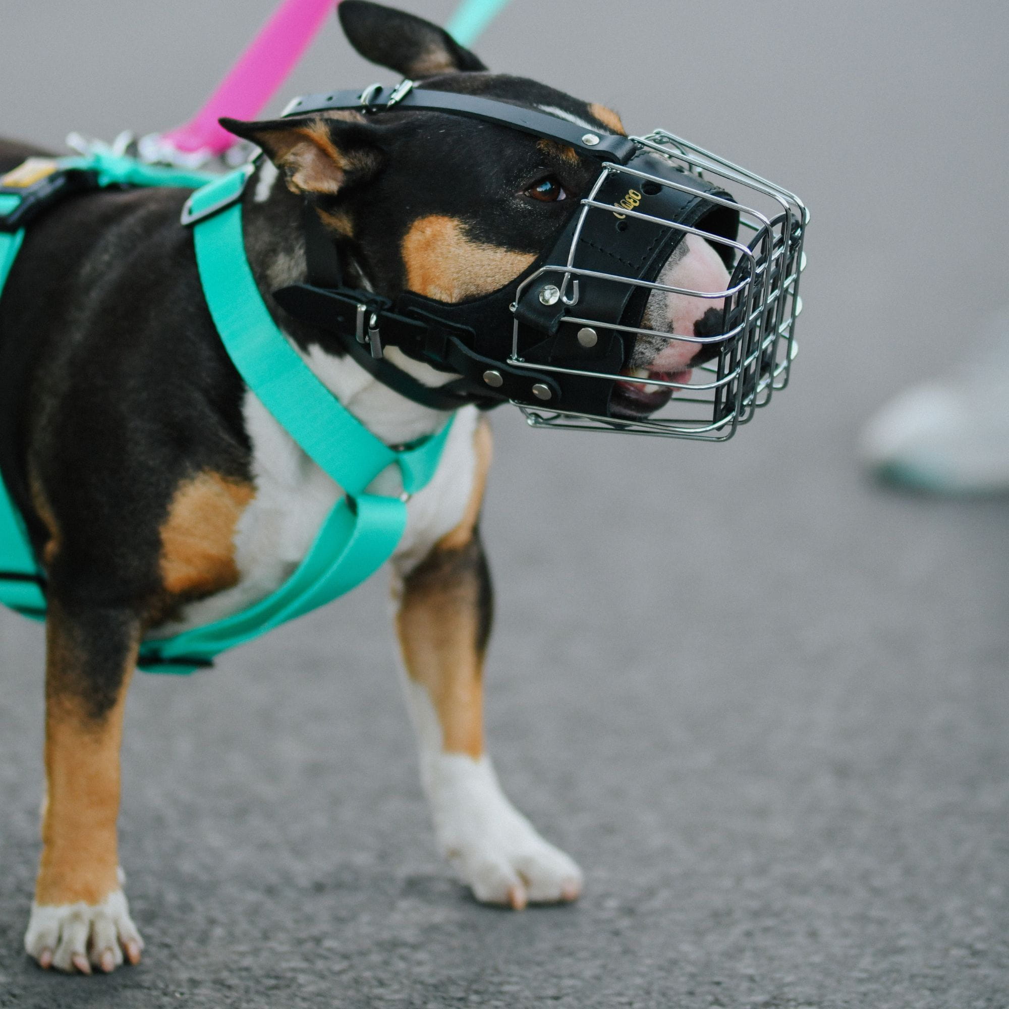 Na spacer trwający powyżej 15–20 minut — wyłącznie kaganiec koszowy (metalowy lub fizjologiczny K9), który pozwala psu swobodnie ziać i pić wodę. Kaganiec zabudowany (skórzany) ogranicza zianie i nadaje się tylko na krótkie sytuacje kontrolowane.