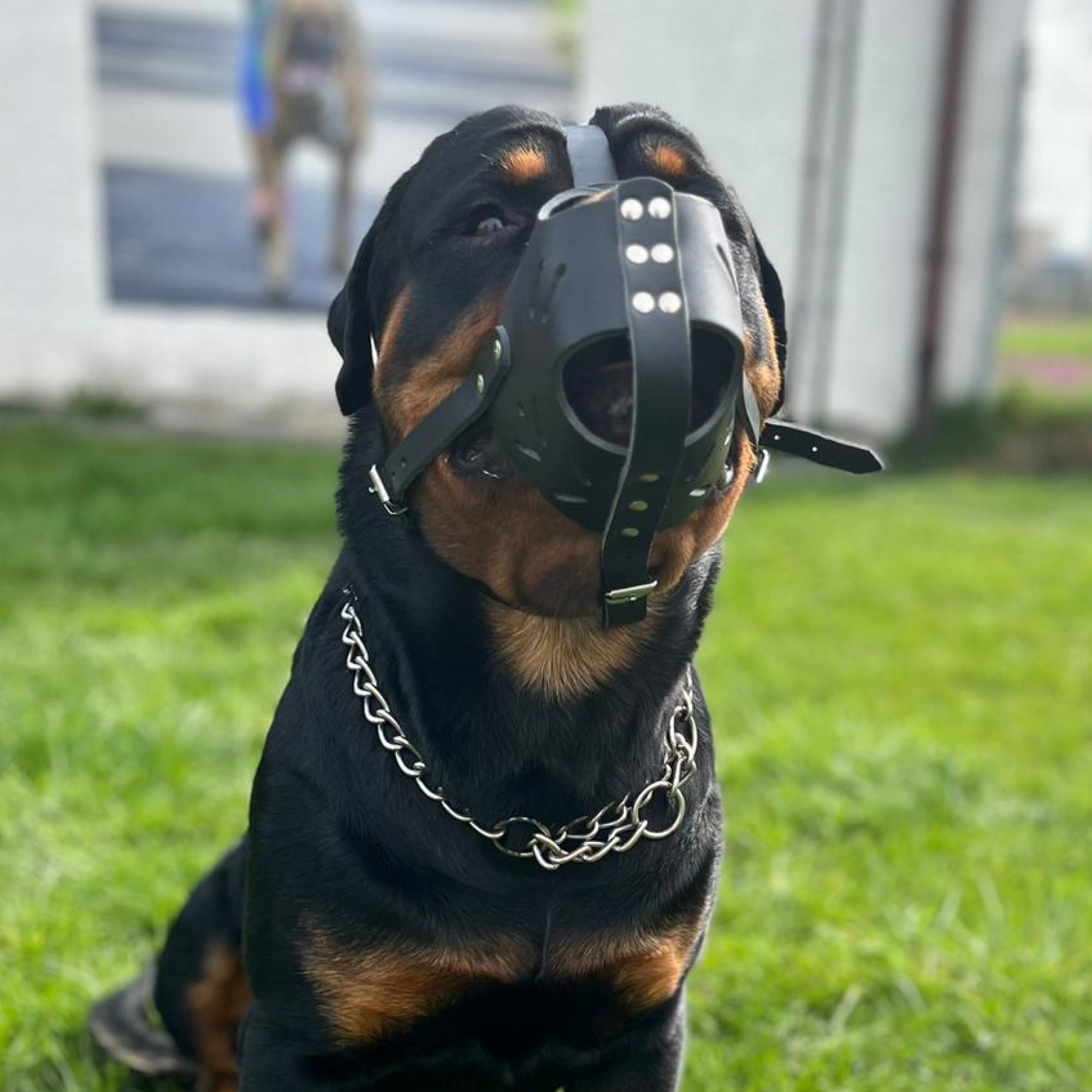 Rottweiler to rasa z prawnym obowiązkiem kagańca w miejscach publicznych. Silna budowa wymaga solidnego modelu — metalowy bojowy lub fizjologiczny K9 Dingo Gear dla rottweillera (pies: S03042, 10 cm/42 cm; suka: S03041, 9 cm/40 cm). Modele K9 mają oddzielne warianty dla psa i suki bo różnią się budową kufy. Skórzany nitowany nr 8–10 jako opcja lżejsza.