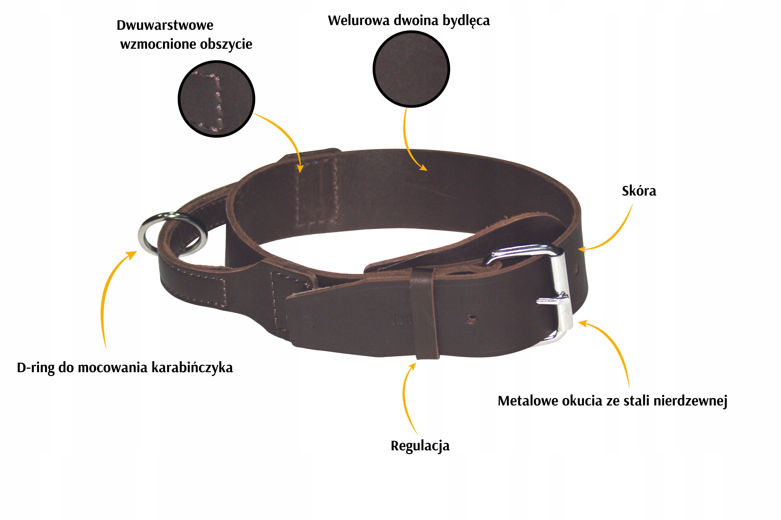 ✔ Skórzana zakładka pod klamrą – ochrona przed przycięciem sierści