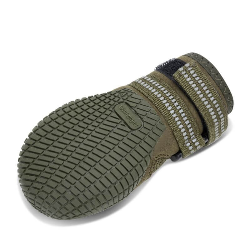 - Podwójne zapięcie na rzepy — but pewnie trzyma się łapy bez uciskania; łatwe i szybkie zakładanie nawet u psów, które nie lubią manipulowania przy łapach