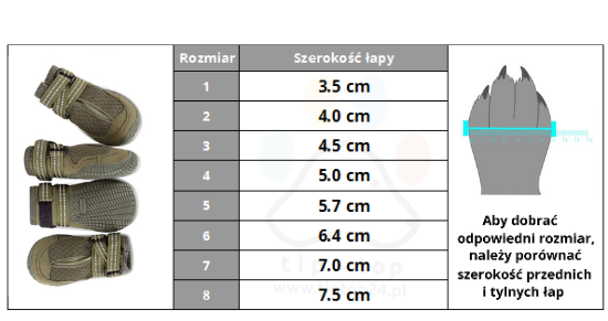 - Opakowanie zawiera 2 sztuki — jeden komplet to dwa boty; przy różnych rozmiarach przednich i tylnych łap można zamówić dwa komplety w różnych rozmiarach