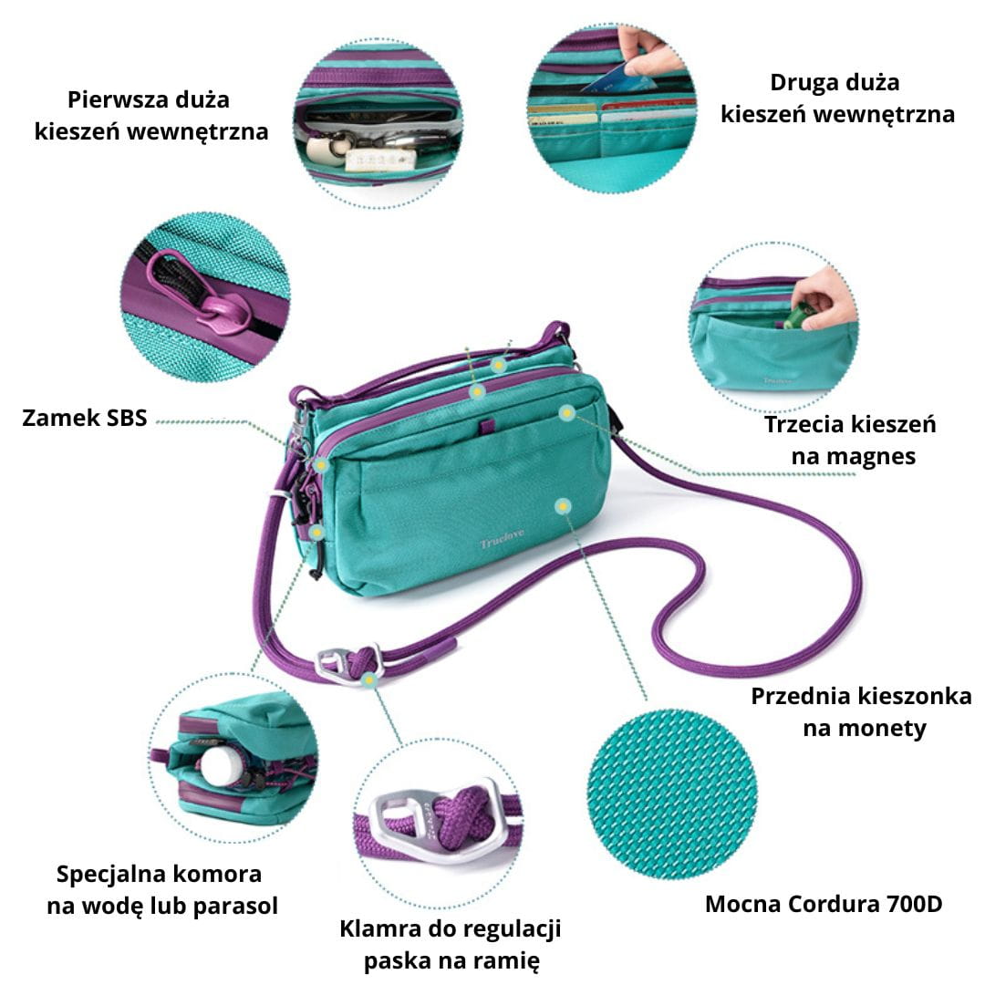 Dzięki przemyślanej konstrukcji pozwala mieć wszystko pod ręką, jednocześnie uwalniając ręce i zwiększając komfort poruszania się.