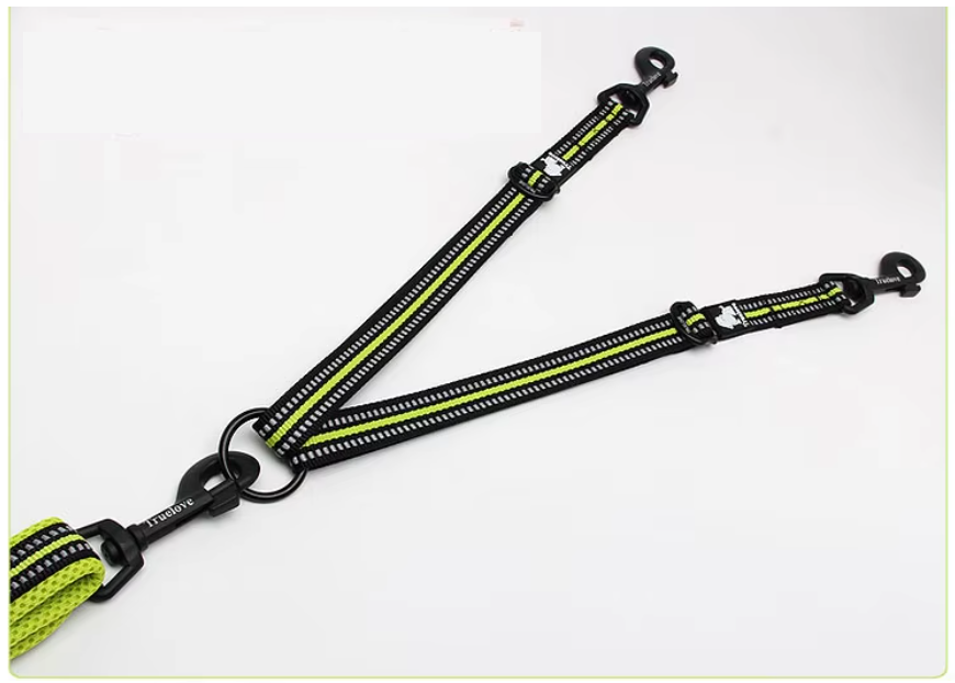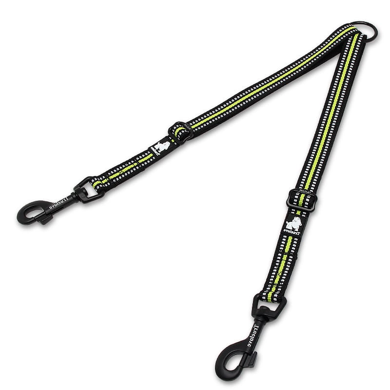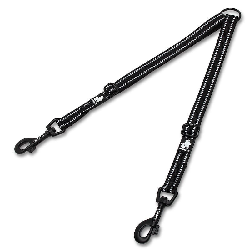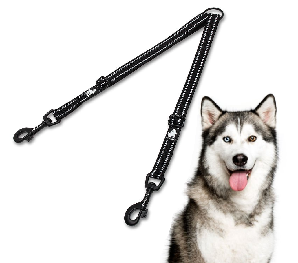 Każde ramię dwójnika jest regulowane niezależnie — możesz ustawić różną długość dla każdego psa, co przydaje się gdy prowadzisz psy różnej wielkości lub temperamentu. Krótsze ramię dla psa, który chodzi bliżej nogi, dłuższe dla tego, który lubi trochę więcej swobody.