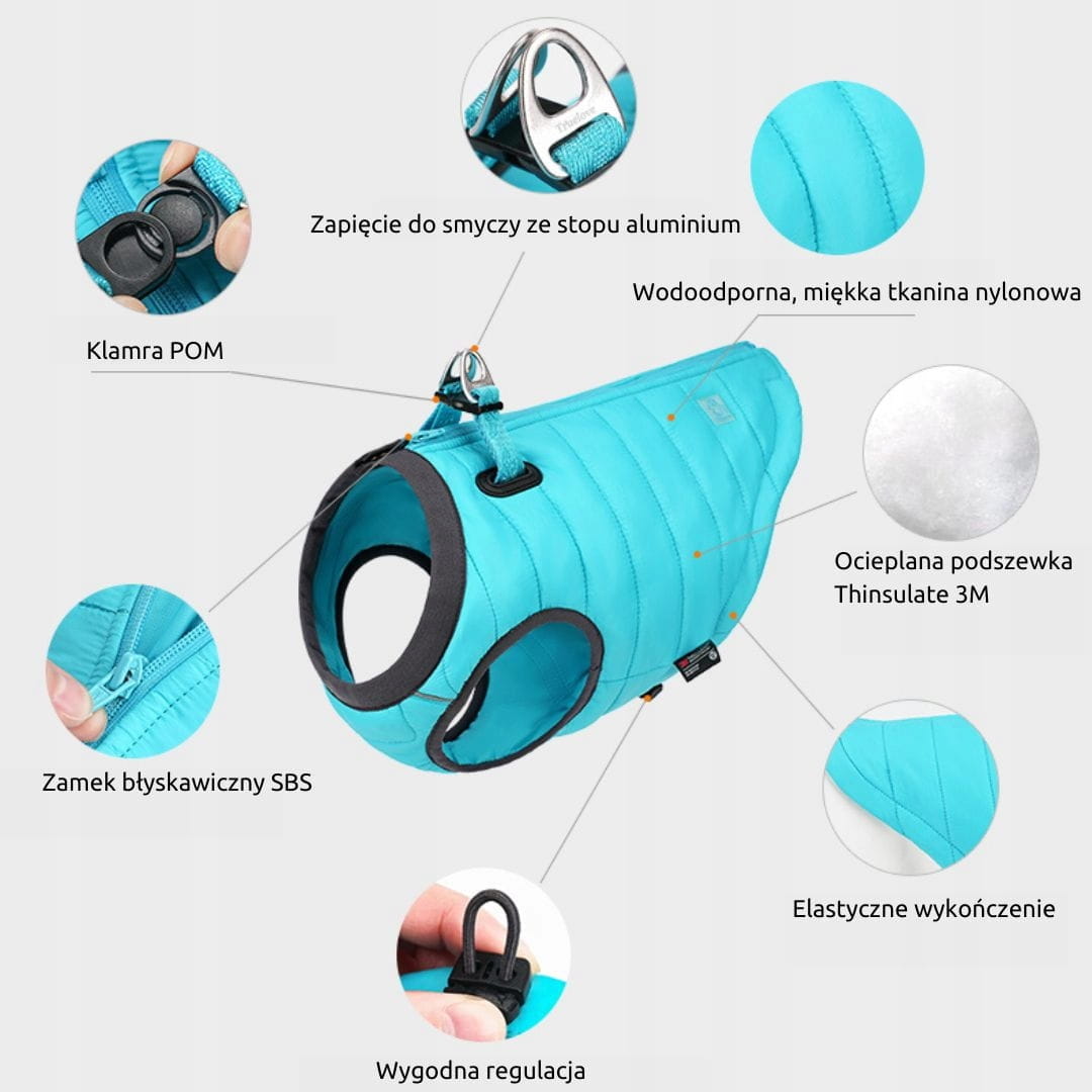 - Ultralekka konstrukcja — pies porusza się swobodnie; idealna do aktywnych spacerów zimą