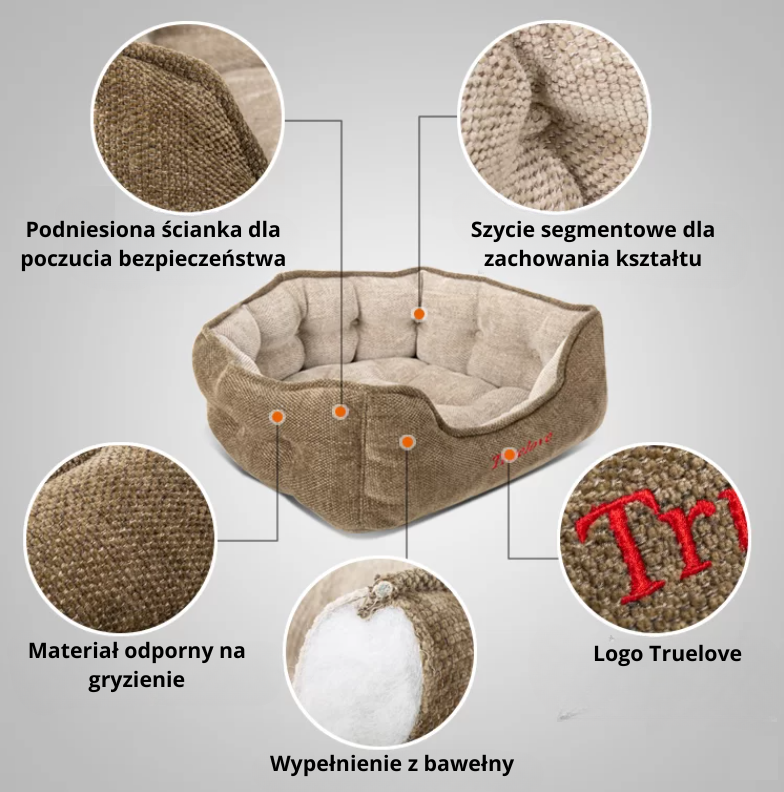 - Segmentowe szycie — utrzymuje stabilny kształt legowiska nawet przy intensywnym użytkowaniu