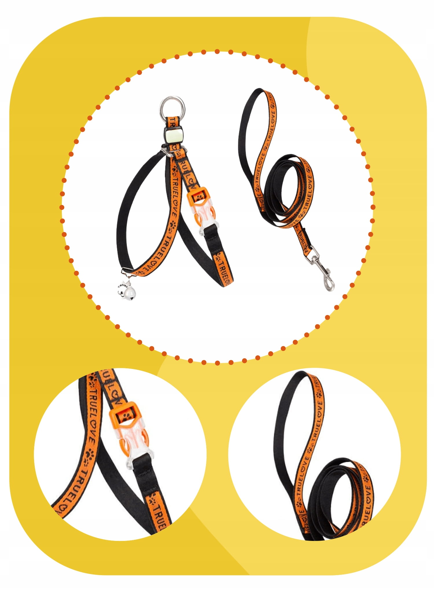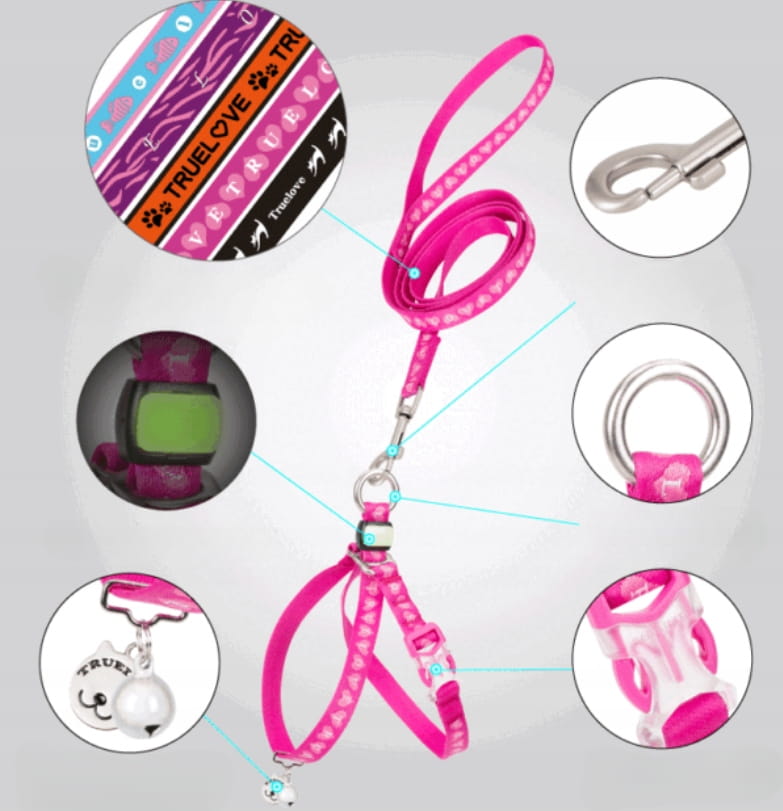 - W zestawie: szelki + smycz 120 cm + dzwoneczek + zawieszka