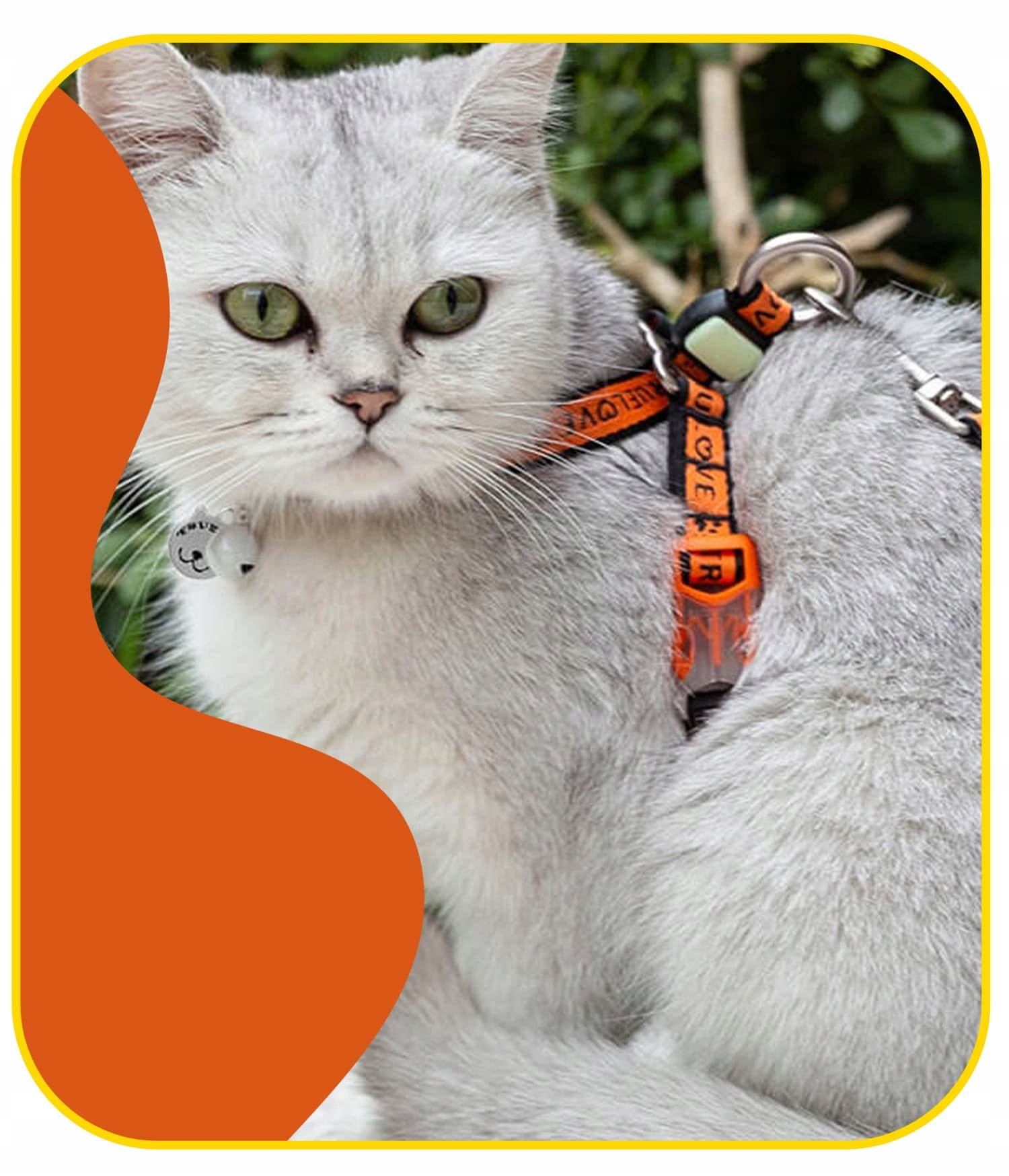- Dzwoneczek i zawieszka — ozdobne dodatki dołączone do szelek; dzwoneczek ostrzega ptaki i małe zwierzęta podczas spaceru