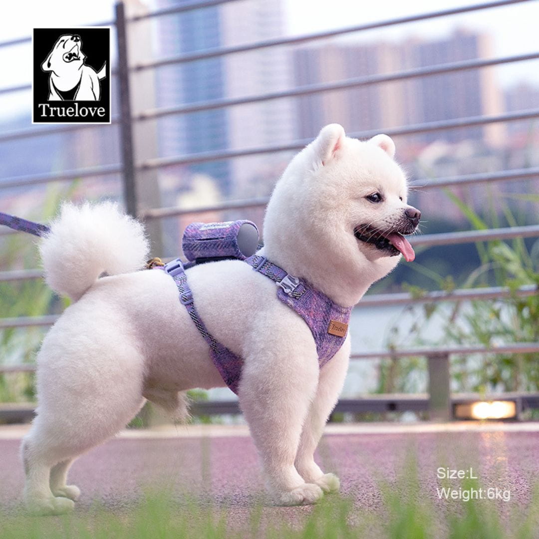 Lekkie i eleganckie szelki guard dla psa Truelove Harris Tweed z dodatkami. W zestawie smycz i mini plecaczek w czerwono-czarną kratkę. Idealne dla małych psów.