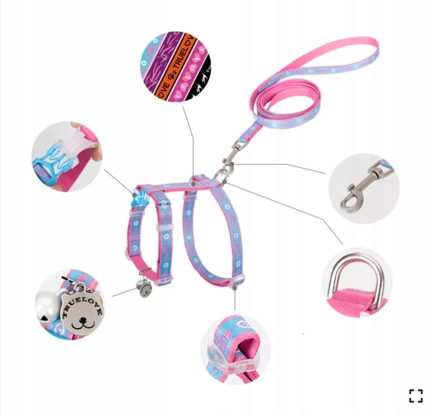 - W zestawie: szelki + smycz 120 cm + dzwoneczek + zawieszka-kot