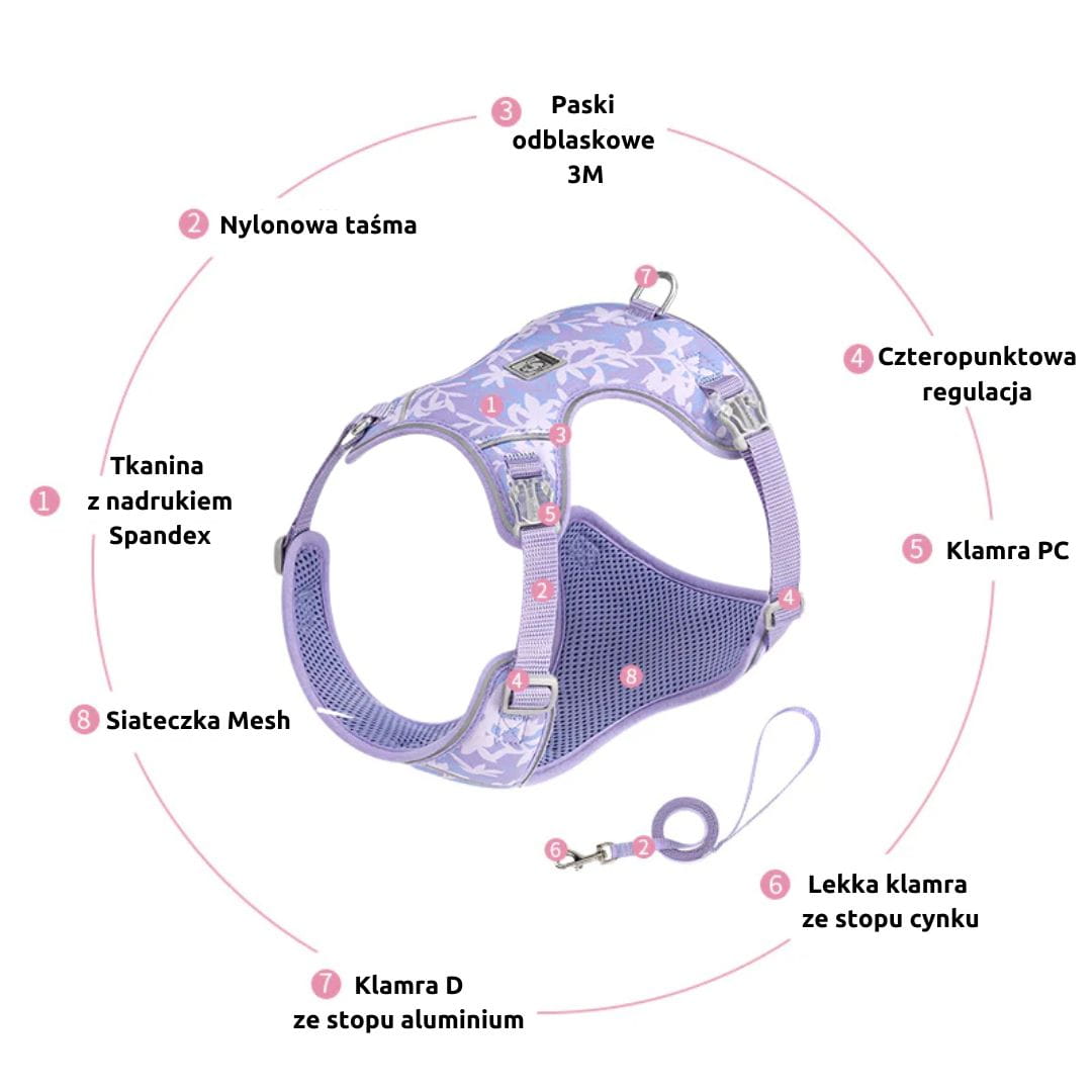 Zestaw zawiera szelki guard z siateczki MESH oraz smycz 180 cm kolorystycznie dopasowaną do szelek — kompletny komplet spacerowy gotowy do użycia od razu po zakupie.