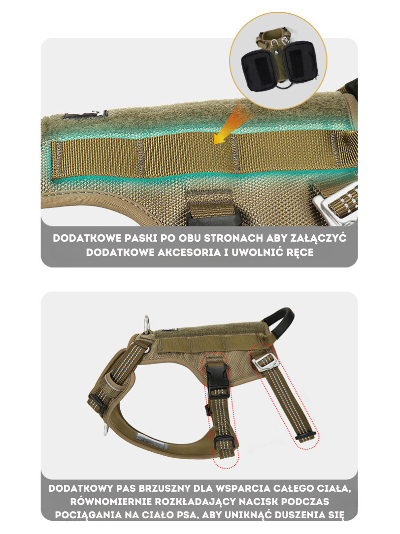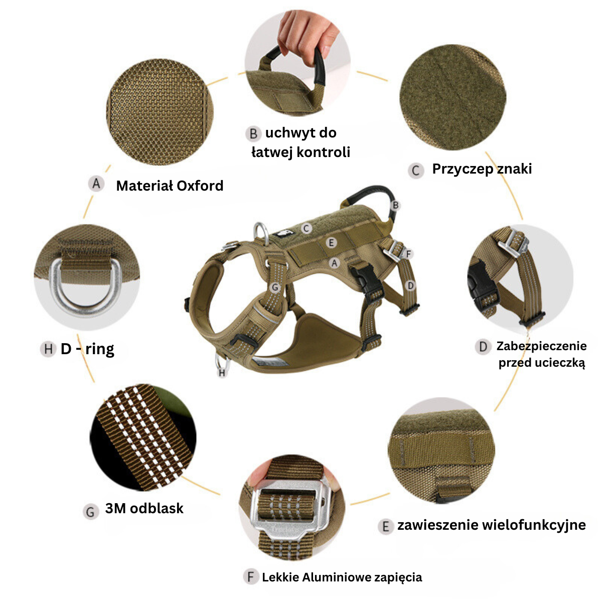 - ergonomiczny uchwyt na grzbiecie — szybkie przytrzymanie psa w nagłych sytuacjach