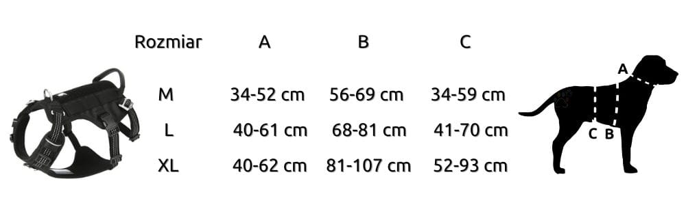Uwaga: producent zawyża rozmiarówkę — w tym modelu zalecamy wybór większego rozmiaru w przypadku wątpliwości. Szczegółową instrukcję pomiaru znajdziesz w poradniku: jak zmierzyć psa i dobrać rozmiar szelek.
