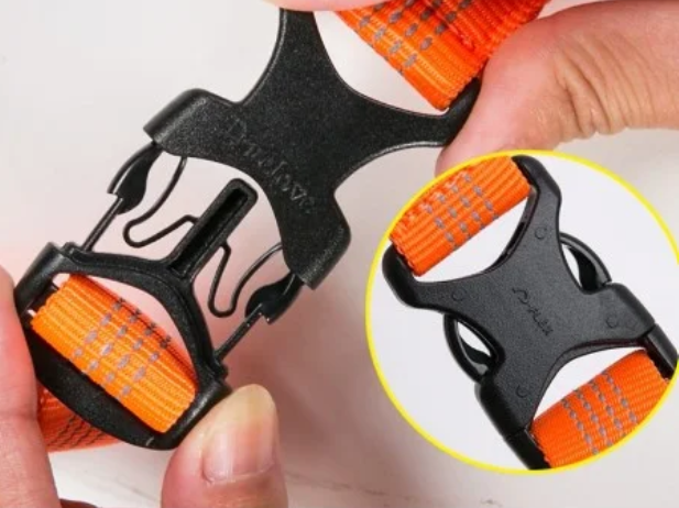 - Guard + easy walk w jednym — tylny D-ring na grzbiecie do codziennych spacerów; przedni D-ring na klatce piersiowej do treningu antyciągowego; przy szarpnięciu przedni D-ring obraca psa w stronę właściciela zamiast pozwolić mu parć do przodu; więcej: jak oduczyć psa ciągnięcia na smyczy